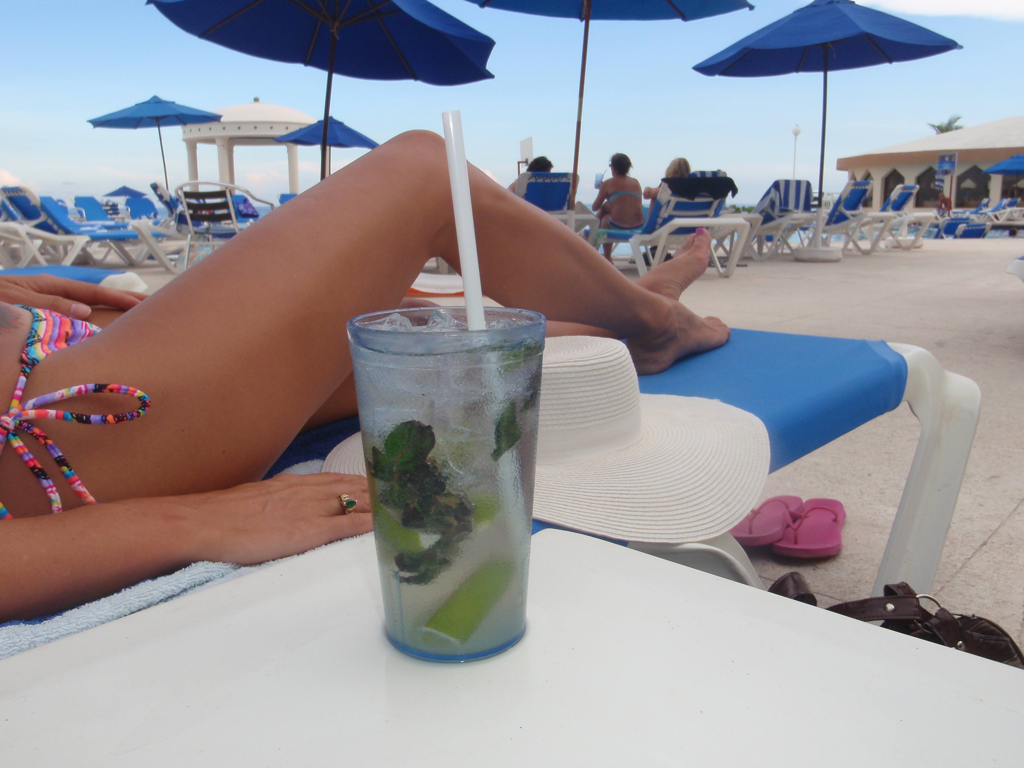 Next we head out to the pool to soak up the warm Cancun sun. The hotel is perfect for us because they do play some music, but not loud and they do have some entertainment, but not crazy. Just very relaxing. We order a couple of drinks before we find the perfect one. Miami Vice, piƱa colada, sex on the beach…nah, too sweet. We switched to beer by afternoon.