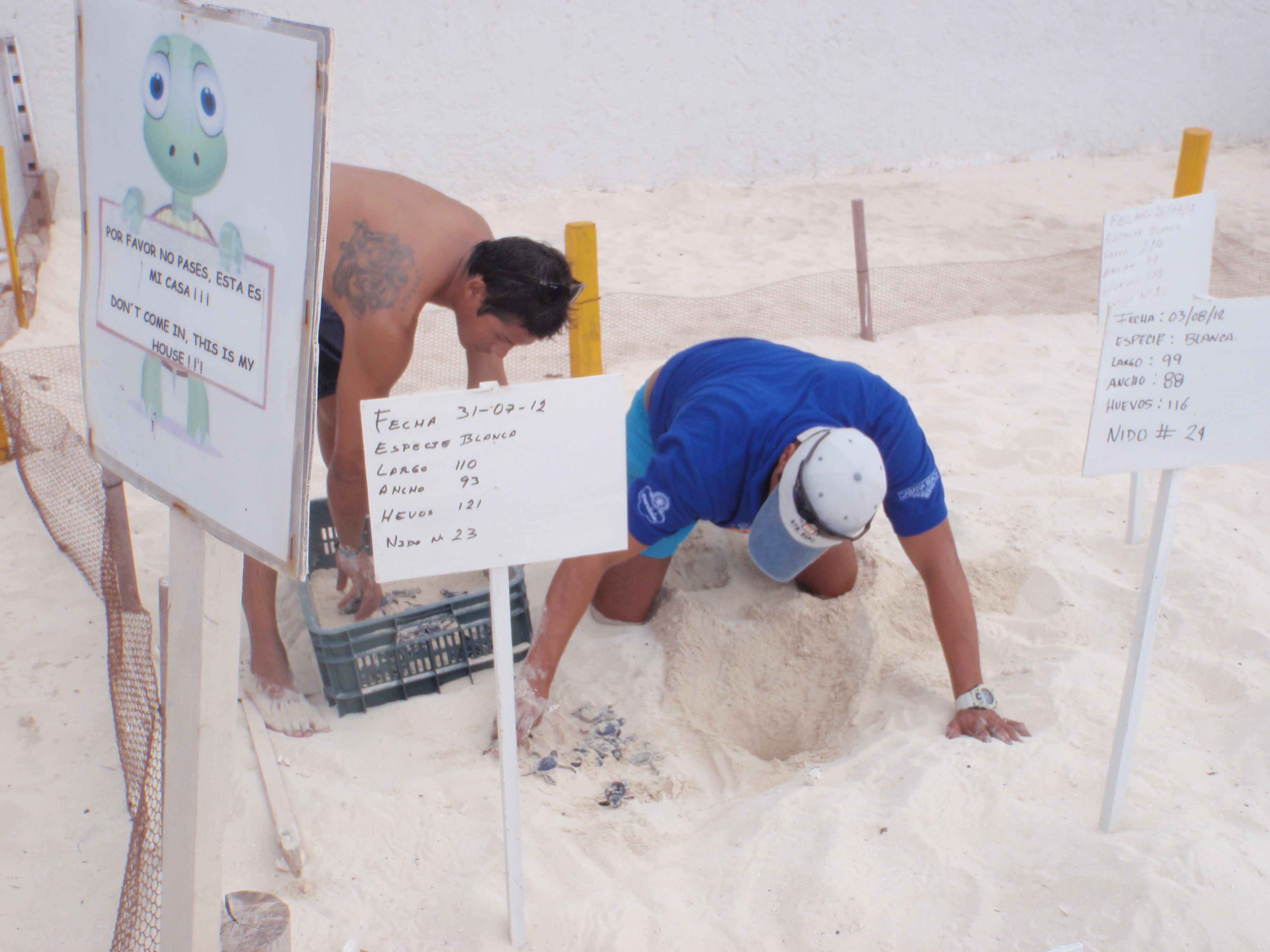 While there are many places on Cancun beaches where the sea turtles makes their nests, sea turtles naturally nest a little further south in Akumal in the Riviera Maya. Akumal is a 1 hour 15 minute drive from Cancun.